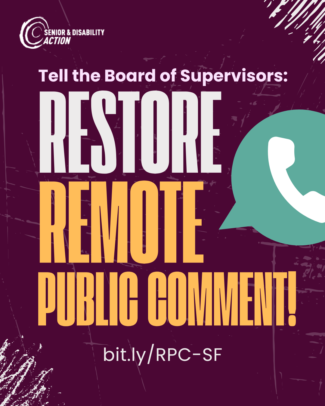 Originally enacted at the beginning of the pandemic, the BOS repealed remote public comment in fall 2023, shutting out the voices of so many San Franciscans who can't, for myriad reasons, make it to City Hall in the middle of the day to give comment in person. Contact your Supervisors today! For more talking points and information on this issue, check out our Remote Public Comment campaign letter and sign up here to get more involved!