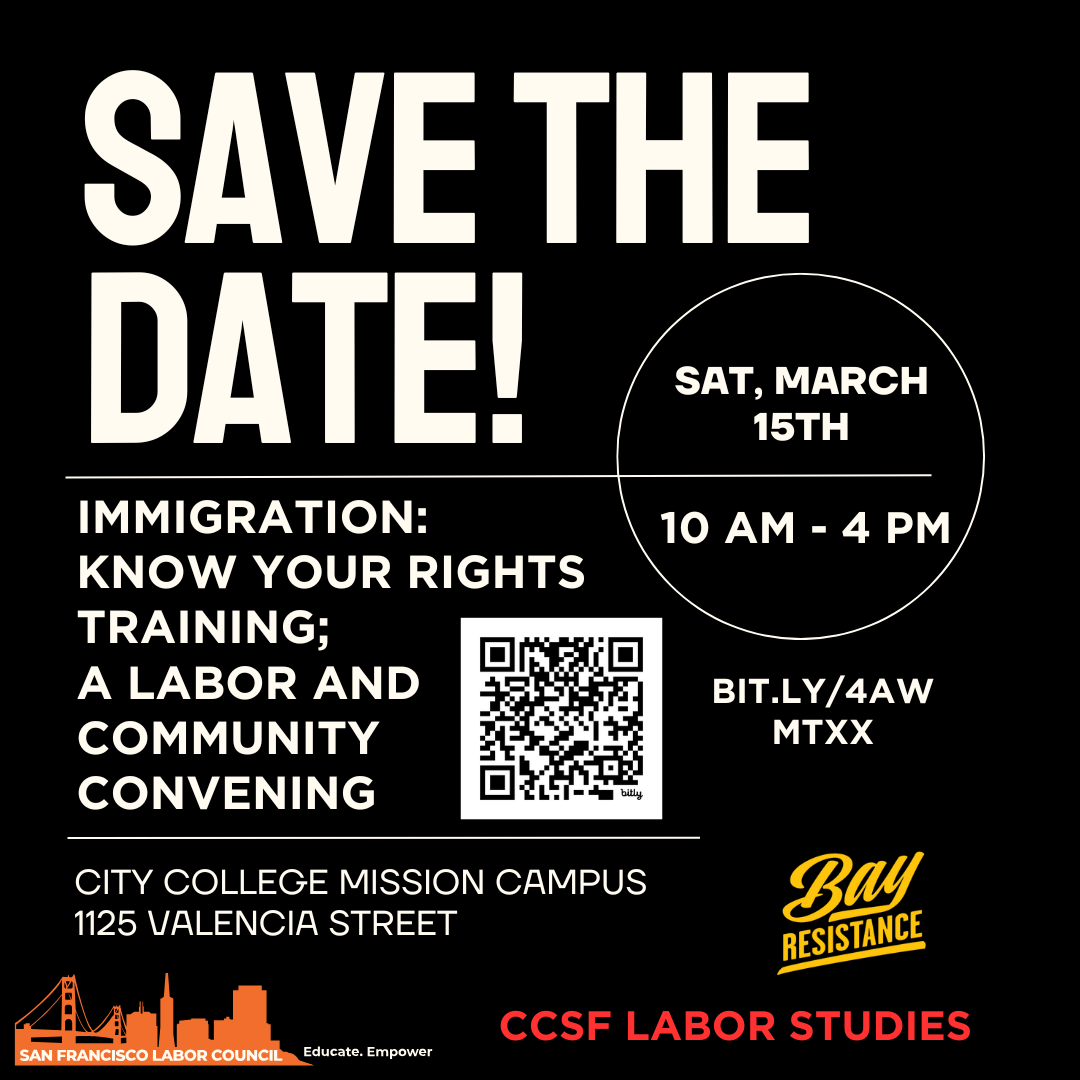 SF Labor Council, City College of SF Labor and Community Studies Department, and Bay Resistance are co-sponsoring this Know Your Rights event on Saturday, March 15, 10am to 4pm at the Mission Campus (1125 Valencia St, SF). The training will be not only for people with immigration concerns, but for workers who directly serve immigrants. Thanks to the SF Labor Council, the event will be multilingual. English, Vietnamese, and Spanish translation confirmed currently, and that list will grow in the coming days. RSVP to the Know Your Rights training here.